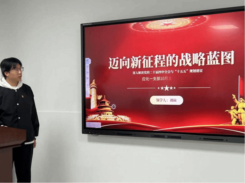 支部党员刘硕带领党员同志们深入解读党的二十届四中全会与“十五五”规划建议,四大核心任务指明了发展方向。他说,青年学子要紧跟党的领导,学好化学专业知识,积极参加科研实践活动,以实际行动践行初心,努力成长为可堪大用的时代新人。