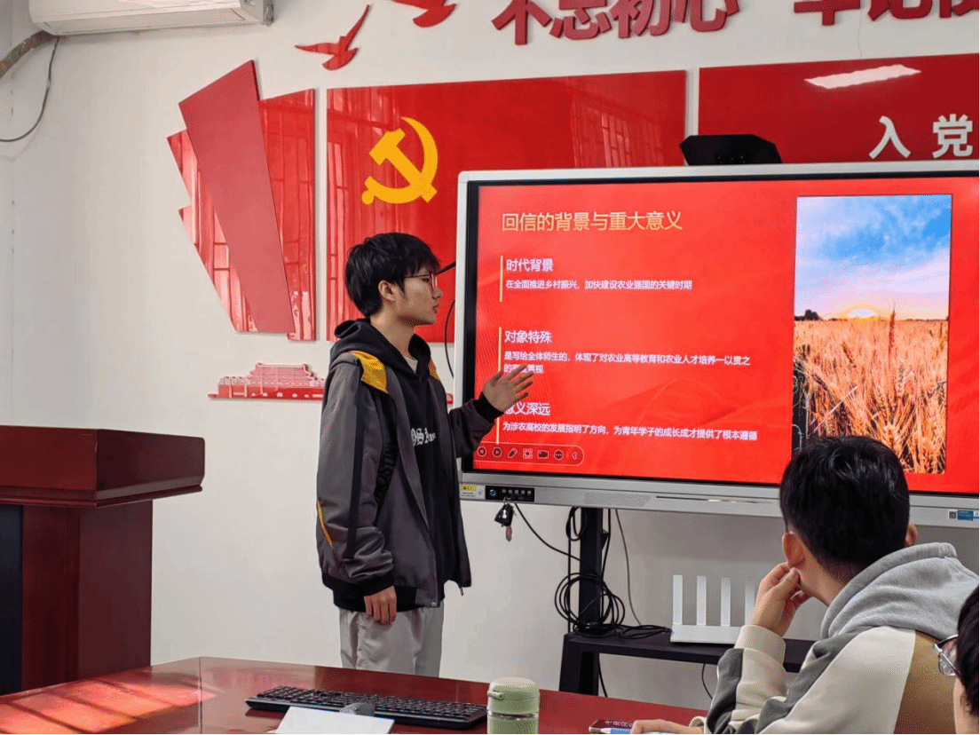 肖宗阳同志带领支部党员共同学习研讨习近平总书记给中国农业大学的重要回信精神。他提到,作为新时代的青年员工党员,要积极学习回信精神,勇担强农使命,刻苦钻研,练就过硬本领,争做知农爱农新时代英才。