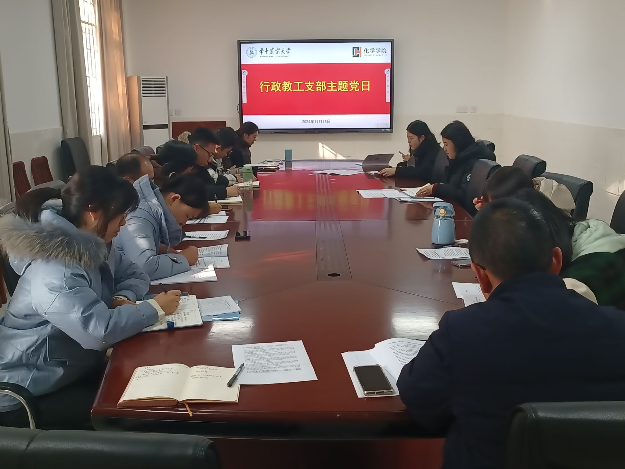 (通讯员:汪献芳)12月18日上午,行政教工党支部在化学楼A106会议室开展主题党日活动,专题学习党的二十届三中全会精神、《党史学习教育工作条例》、习近平总书记在湖北考察时的重要讲话精神等。会议由支部书记周静舫主持,支部全体党员参加。