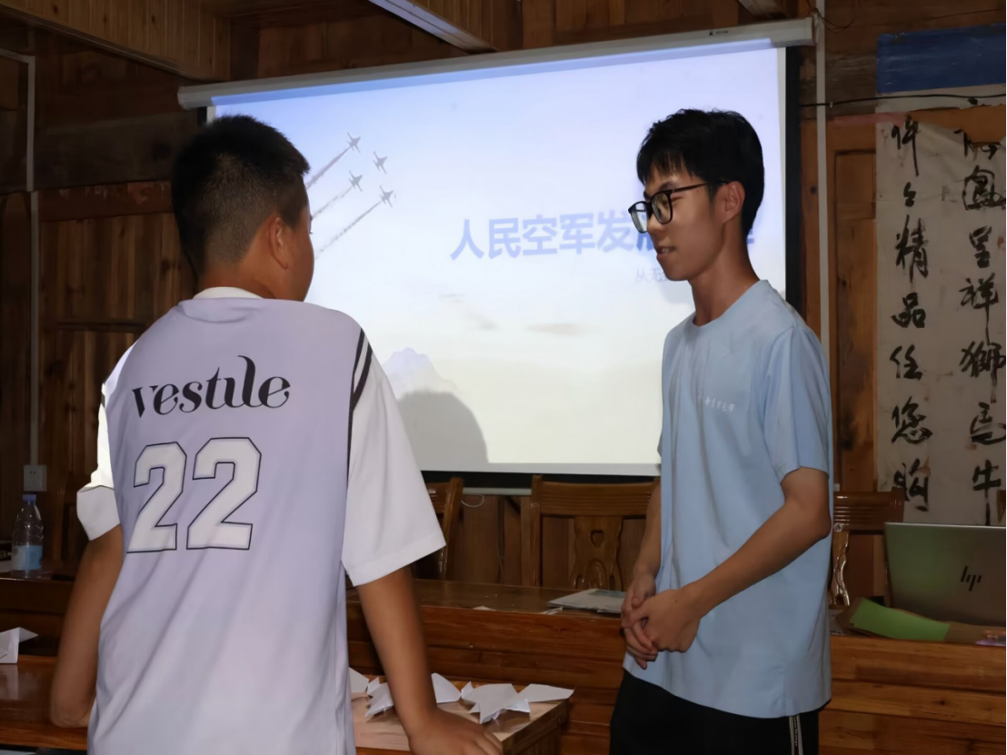 实践队员开展国防教育课程,展示歼-5、歼-8、歼-10等战机图片,通过讲述我国航空事业从仿制到自主研发的进程,重点介绍歼-20 首飞、设计及技术突破意义,让孩子们感受国防力量的崛起与艰辛。 “我长大以后一定要当飞行员,守卫祖国的蓝天!” 这是在播放歼-10研究历程纪录片后,一位小朋友有感而发。 实践团成员们带领孩子折纸飞机,以趣味实践深化国防知识认知,引导他们直面失败、反复改进,在实践中领悟坚持的意义,厚植责任担当意识。