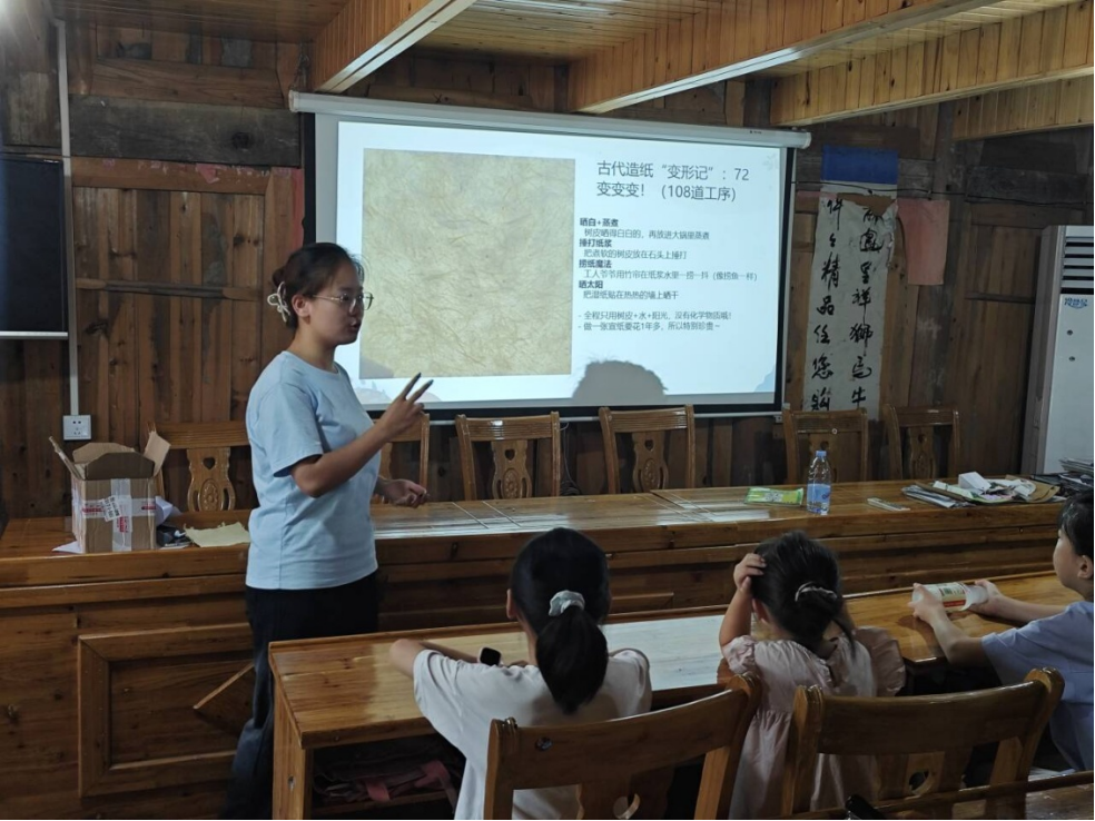 将知识竞赛与实践体验结合,让一场 “传统文化大比拼” 点燃热情。 成语接龙大战里,由实践团队成员出题,小朋友们30秒头脑风暴疯狂输出,背诵经典诗词、典故,在竞赛中感受传统文化魅力。 实践队员还化身 “传统文化魔法师”,带着小朋友们钻进四大发明之造纸术的奇妙世界。 小朋友们小组合作,通过泡纸、捣碎、捞纸等步骤,深入了解了有着 1200 年历史的宣纸。