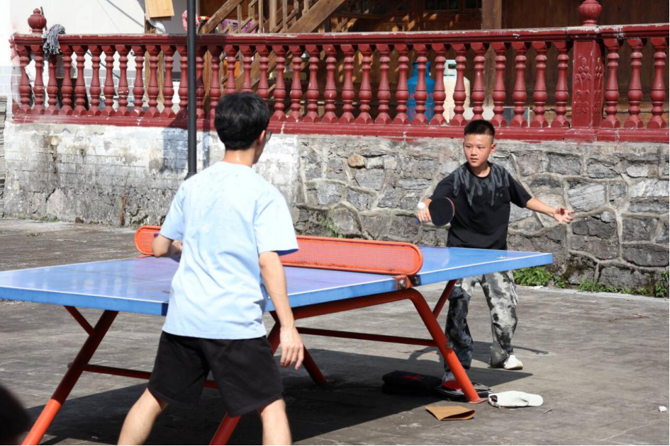 实践队成员与孩子们进行乒乓球比赛 郭慧摄