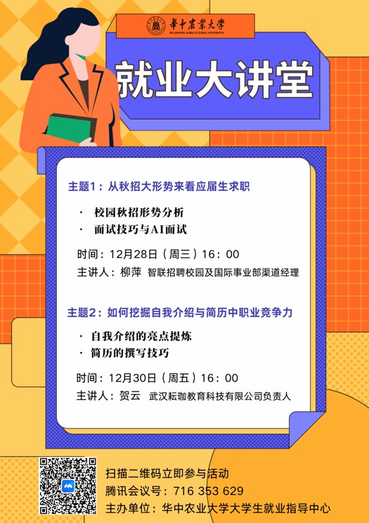 2022年12月28、30日开展就业大讲堂活动,活动邀请智联招聘、耘珈教育的指导老师围绕秋招、自我介绍、简历、面试开展在线讲座,请未找到工作和考研结束的同学参与。