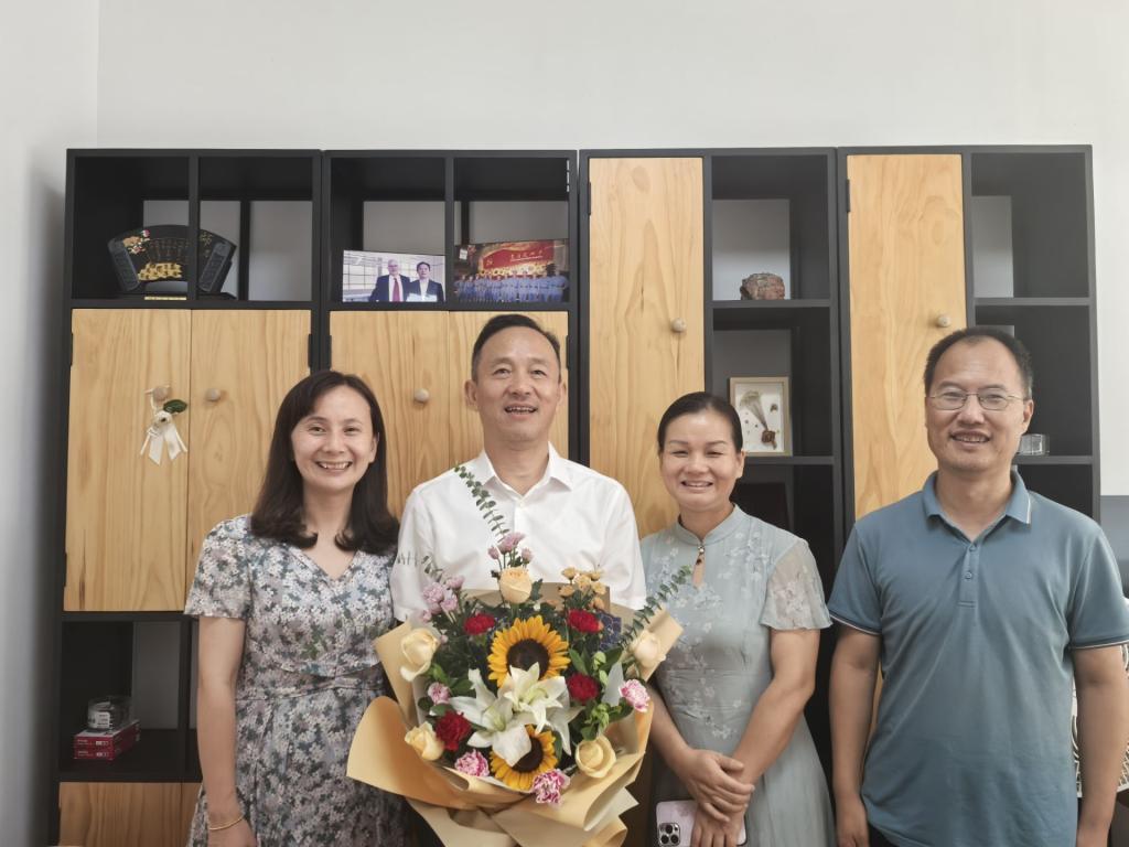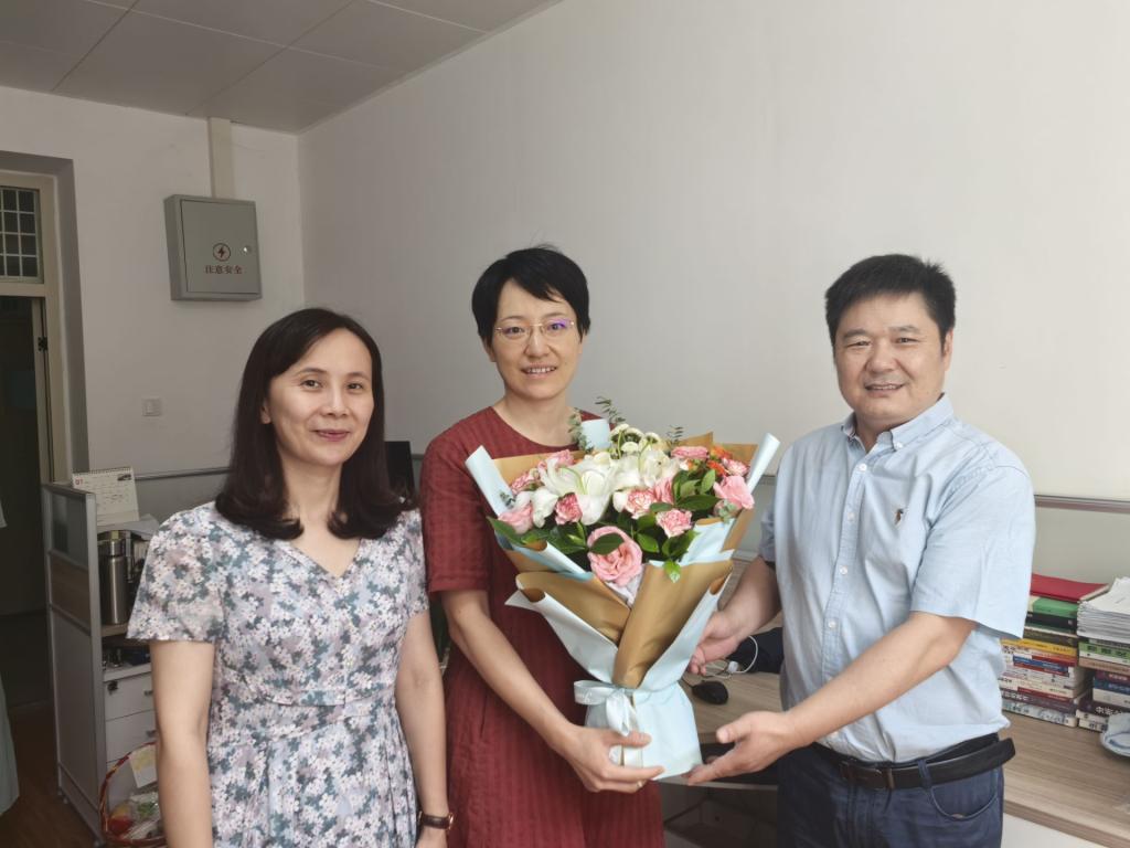 9月10上午9:30公司党委书记涂俊才、经理曹菲菲、副经理、工会主席曹敏惠及相关老师看望陈浩、陈璐两位老师,向他们献上一束鲜花,道一声“节日快乐”,通过他们向院教师送上节日的问候和祝福。