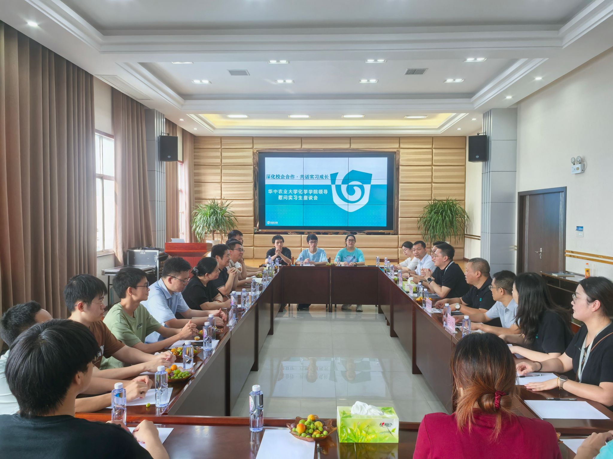 座谈会前,公司领导与公司负责人共同前往员工实习地点,详细了解员工实习状况、具体内容与生活情况。同学们在合成部、发酵部、质检部及样品分析等岗位的实践表现得到公司技术人员的充分肯定。回盛公司领导表示:“华农学子专业扎实、学习主动,为生产环节提供了新思路。”曹敏惠对回盛公司提供的实践平台表示感谢,并强调:“校企合作是培养应用型人才的重要途径,希望未来进一步推动产学研深度融合。”公司领导对员工实习表现给予肯定,并叮嘱大家珍惜实践机会,认真学习专业技能。